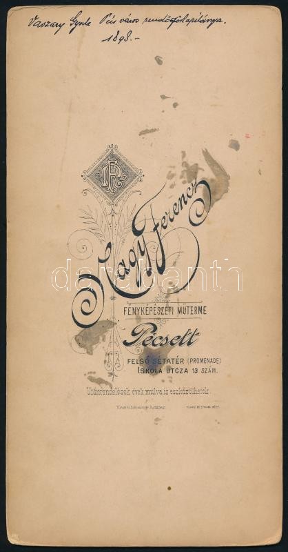 1898 Vaszary Gyula (1848-1913) Pécs város rendőrfőkapitánya, Mecsek Egyesület alapító választmányi tagja, majd igazgatója (1891-1901), keményhátú fotó, Pécs, Nagy Ferenc, 20x10 cm