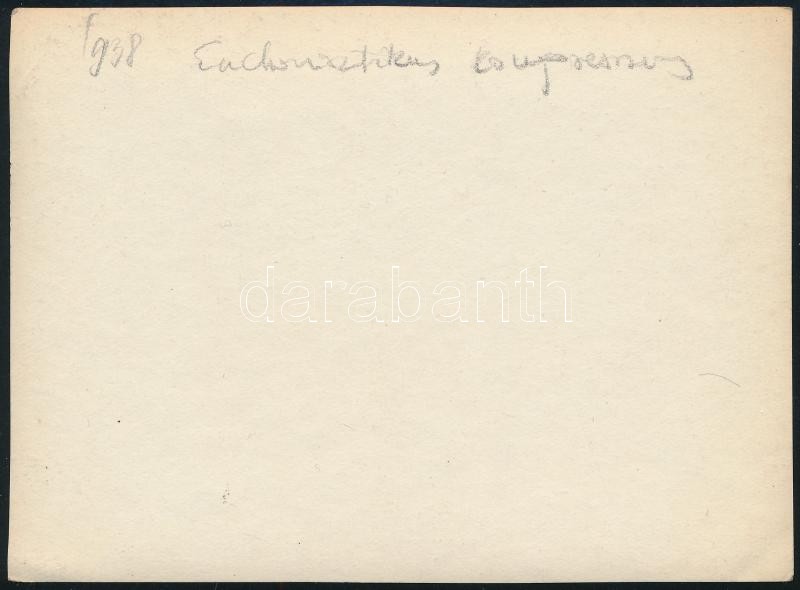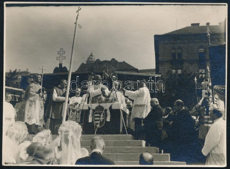 1938 Eugenio Pacelli (1876-1958) bíboros, a későbbi XII. Piusz pápa beszél az 1938-as Eucharisztikus Világkongresszuson, a fotón Hóman Bálint kultuszminiszter és más egyházi méltóságok, 8×10,5 cm / Eugenio Pacelli (1876-1958) cardinal, later Pope Pius XII on the 1938 International Eucharistic Congress in Hungary, with other high ranking catholic priests on the photo