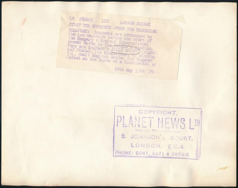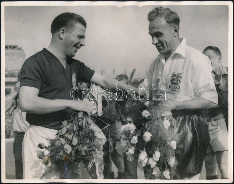 1954 Magyarország-Anglia, a legendás 6:3-as labdarúgó mérkőzés visszavágója, ahol ismét a magyarok győztek, ezúttal 7:1-re. A mérkőzés kezdetekor készült eredeti sajtófotó melyen a két csapat kapitánya, Puskás Ferenc és Billy Wright csokrot adnak egymásnak. Pecséttel jelzett, feliratozott sajtófotó, a felső sarkán egy halvány hajtásnyommal 25,5 x 20,5 cm / 1954 Hungary - England, return match of the legendary football match 6:3. In this return match also the Hungarian Golden Team won (7:1). Official press photo at the begining of the match where the two captains Puskas and Wright exchange bouquets. Slght fold mark. 25,5 x 20,5 cm