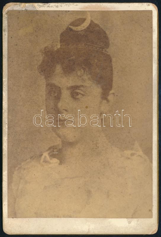 cca 1888 Vetsera Mária Alexandrina (1871-1889) bárónő, Rudolf trónörökös szeretőjének keményhátú fotója, sarka sérült, foltos, 16×11 cm / Baroness Marie Alexandrine von Vetsera, vintage photo