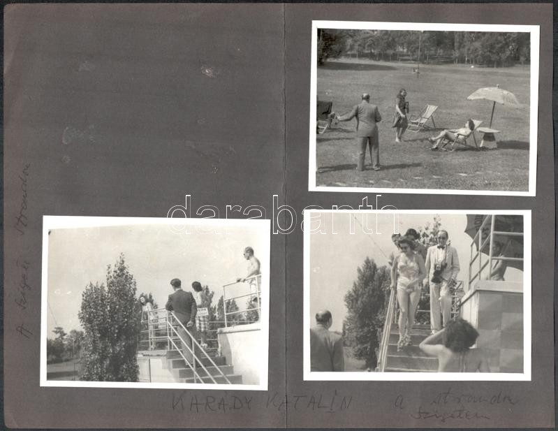 Leírás: cca 1943 Karády Katalin (1910-1990) színésznő a szigeti strandon, 3 db vintage fénykép, egy albumlapra felragasztva, 9x12 cm