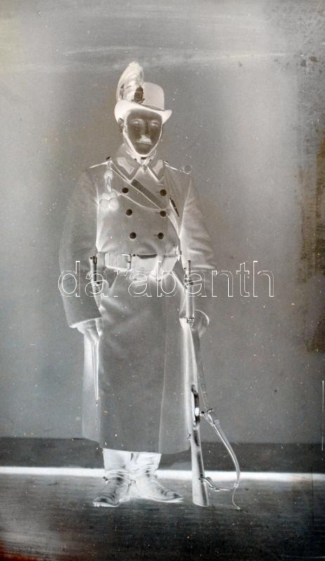 Leírás: cca 1944 Csendőr menetfelszerelésben, fegyverrel, a kiskunfélegyházi Marika-Fotó műterem hagyatékából 1 db vintage üveglemez negatív, 15x10 cm