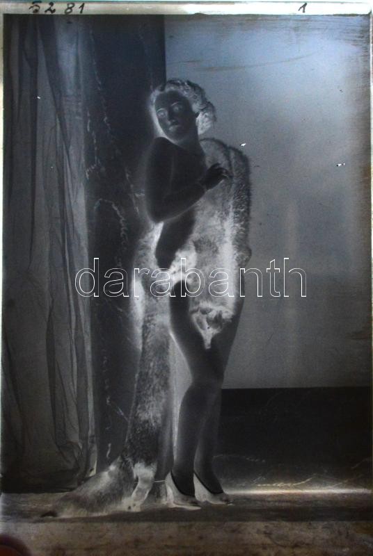 Leírás: cca 1947 Pucér hölgy rókabőrbe bújva, a kiskunfélegyházi Marika-Fotó műterem hagyatékából 1 db vintage üveglemez negatív, 15x10 cm