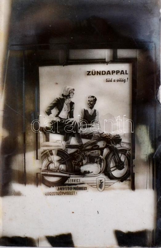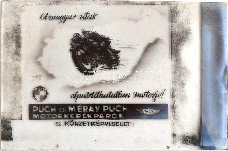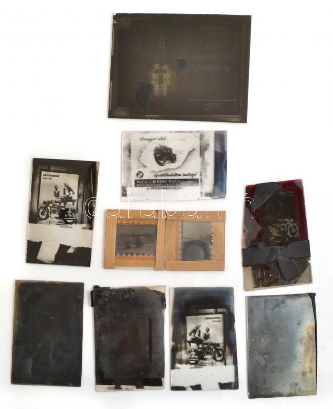 cca 1948 Motorok és motorosok, Fekete György (1904-1990) budapesti fényképész reklámgrafikái és felvételei, 10 db üveglemez negatív és/vagy diapozitív, 24x36 mm és 9x12 cm között