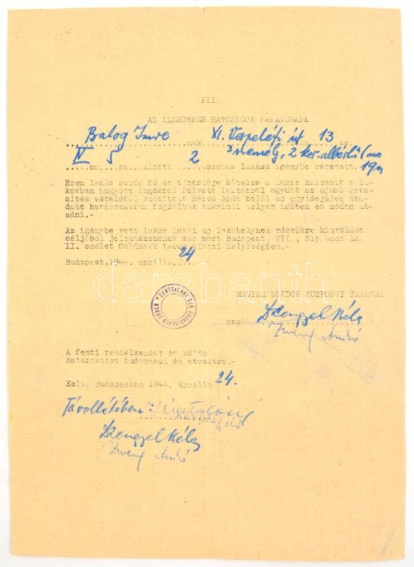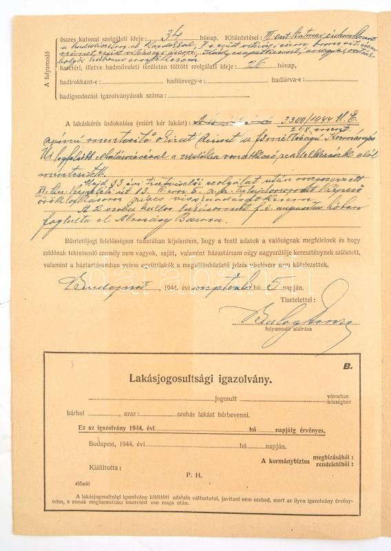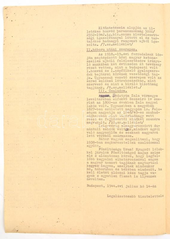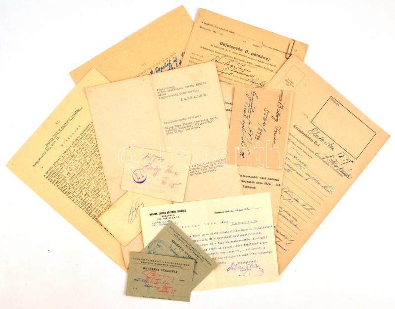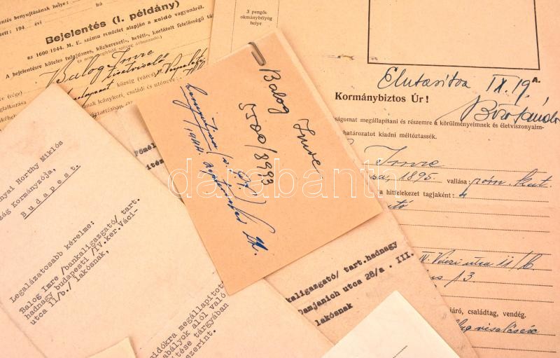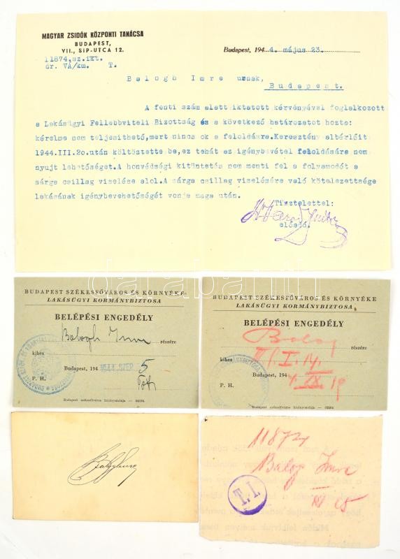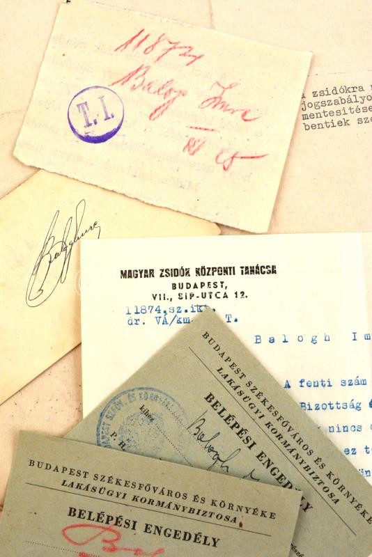 1944 Balogh Imre zsidó származású bankigazgató iratai, I. világháborús veterán (tart. hadnagy, III. oszt. katonai érdemkereszt hadidíszítéssel és kardokkal, 2. oszt. vitézségi érem, bronz vitézségi érem, és német vitézségi érem), 2 kérelem a kormányzóhoz, hogy tartsa meg a magyar nemzet tagjának, valamint a zsidókra vonatkozó vagyonjogú rendeletek alól mentesítse, elutasított lakásigénylési kérelem, bejelentési lap a zsidó vagyonáról, kilakoltatási iratok (2 db, az egyik a Magyar Zsidók Központi Tanácsa fejléces papírján), kérelem elutasítás, egyik része lakásügyi, a másik része, pedig a honvédségi kitüntetések nem mentesítenek a sárga csillag viselése alól: "A honvédségi kitüntetés nem menti fel a folyamodót, a sárga csillag viselése alól. A sárga csillag viselésére való kötelezettsége lakásának igénybevetőségét vonja maga után."(Magyar Zsidók Központi Tanácsa fejléces papírján.)