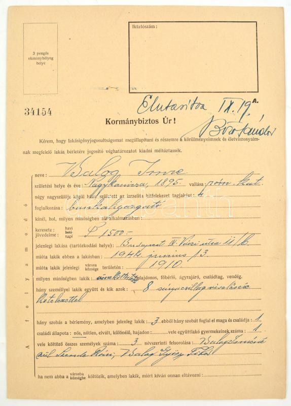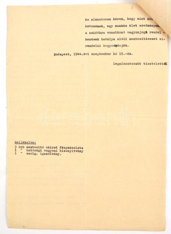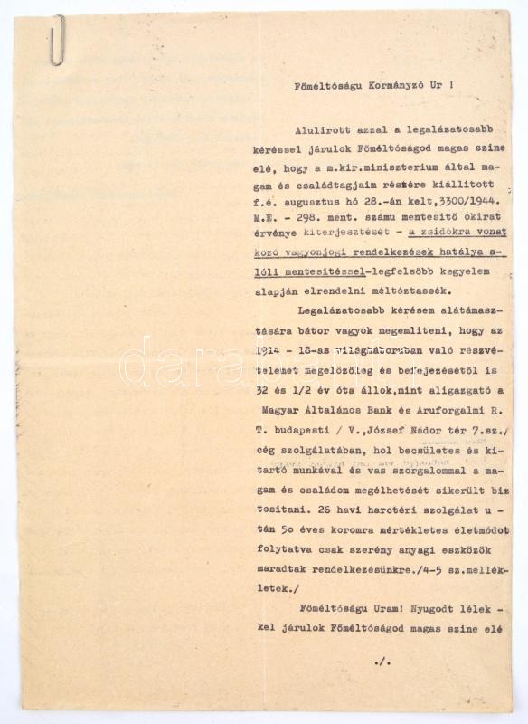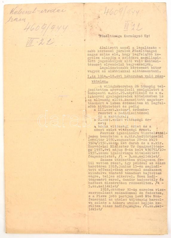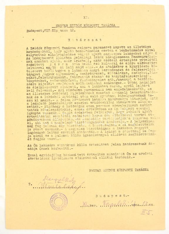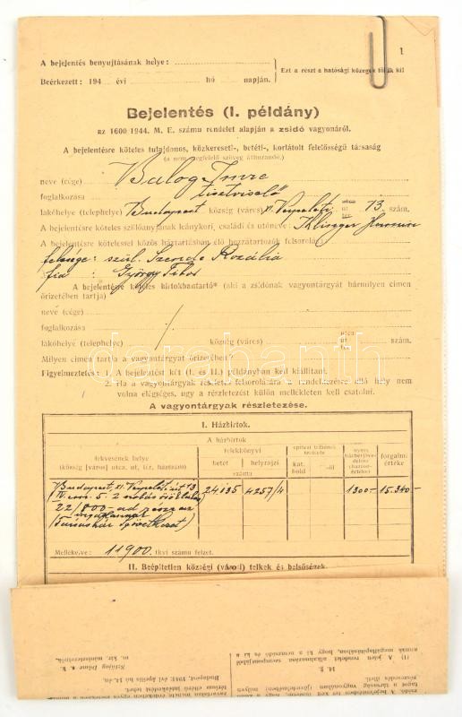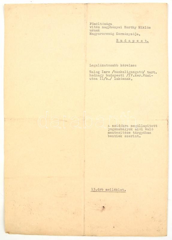 1944 Balogh Imre zsidó származású bankigazgató iratai, I. világháborús veterán (tart. hadnagy, III. oszt. katonai érdemkereszt hadidíszítéssel és kardokkal, 2. oszt. vitézségi érem, bronz vitézségi érem, és német vitézségi érem), 2 kérelem a kormányzóhoz, hogy tartsa meg a magyar nemzet tagjának, valamint a zsidókra vonatkozó vagyonjogú rendeletek alól mentesítse, elutasított lakásigénylési kérelem, bejelentési lap a zsidó vagyonáról, kilakoltatási iratok (2 db, az egyik a Magyar Zsidók Központi Tanácsa fejléces papírján), kérelem elutasítás, egyik része lakásügyi, a másik része, pedig a honvédségi kitüntetések nem mentesítenek a sárga csillag viselése alól: "A honvédségi kitüntetés nem menti fel a folyamodót, a sárga csillag viselése alól. A sárga csillag viselésére való kötelezettsége lakásának igénybevetőségét vonja maga után."(Magyar Zsidók Központi Tanácsa fejléces papírján.)