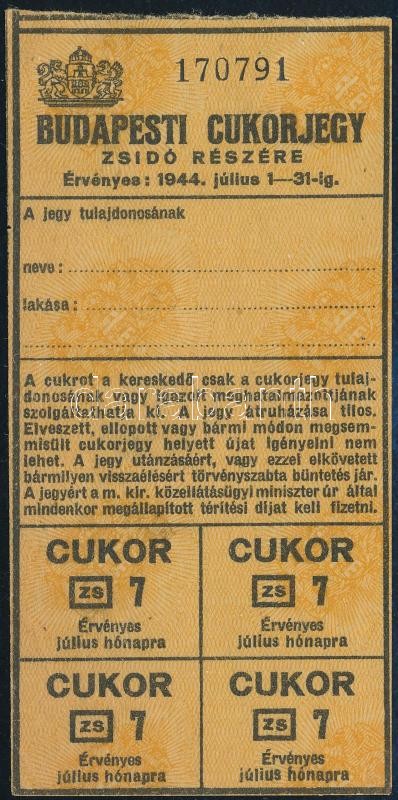1944 Budapesti cukorjegy zsidó részére / 1944 Budapest sugar ticket fo... https://www.darabanth.com/hu/33-Nagyaukcio/33.1/Mutargy-papirregiseg-egyeb/Judaika~13896/1944-Budapesti-cukorjegy-zsido-reszere-1944-Budapest-sugar-ticket-for-a-jewish-person~II2134310