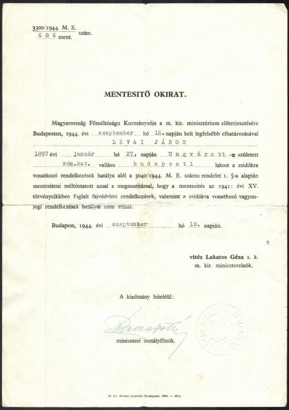 1944 Mentesítő okirat ungvári születésű budapesti zsidó lakos részére, zsidókra vonatkozó rendelkezések alól, "azzal a megszorítással, hogy a mentesítés az 1941: évi XV. törvénycikkben foglalt fajvédelmi rendelkezések, valamint a zsidókra vonatkozó vagyonjogi rendelkezések hatályát nem érinti", 1944 . szept. 18., miniszterelnöki szárazpecséttel. /