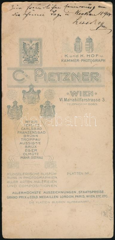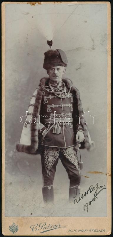 1904 lőrincbányai Littke Ágoston (1838-1911) vezérőrnagy saját kezűleg aláírt fotója, a hátoldalán saját kezű ajándékozási soraival, keményhátú fotó Wien, C. Pietzner műterméből, kissé foltos, 21x10 cm
