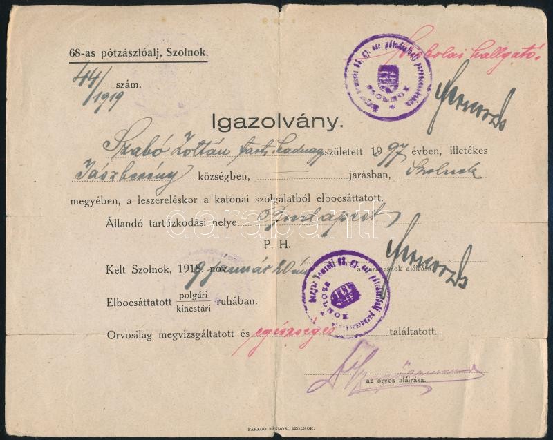 Leírás: 1919 Szolnok, 68. pótzászlóalja leszerelő igazolványa tart. hadnagy részére, 1919. jan. 20., pecsétekkel, aláírással, szakadt.