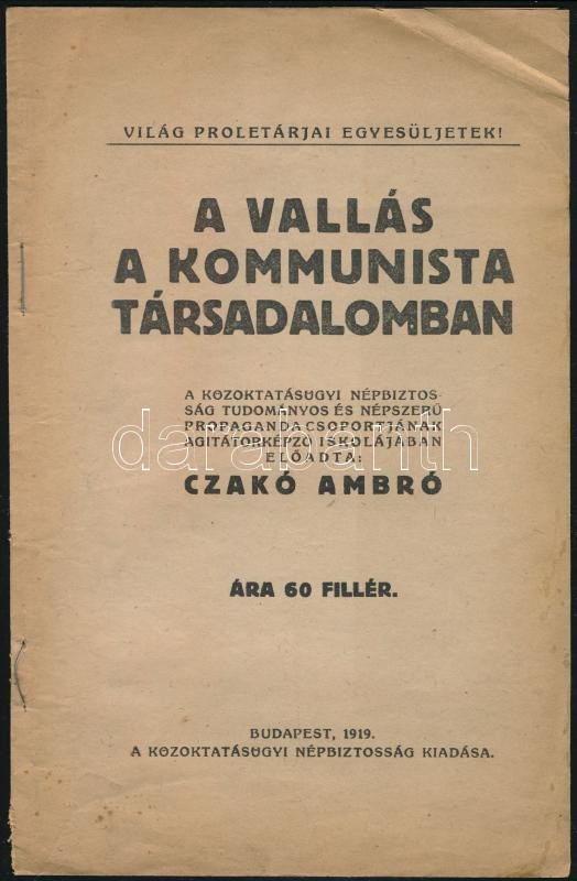 Budapest, 1919. Közo... https://www.darabanth.com/hu/33-Nagyaukcio/33.1/Mutargy-papirregiseg-egyeb/Nyomtatvany~13874/Czako-Ambro-A-vallas-a-kommunista-tarsadalomban-Budapest-1919-Kozoktatasugyi-NepbiztossC3~II2140650