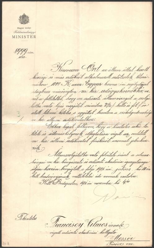 1901 Bp., erdőgyakornoki kinevezés a székelyudvarhelyi M. Kir. Állami Erdőhivatalhoz, Darányi Ignác (1849-1927) földművelésügyi miniszter aláírásával (1895-1903), fejléces papíron / 1901 designation as a forest trainee to the Hungarian Royal Forest Office. With signature of Ignác Darányi (1849-1927), minister for agriculture (1895-1903).