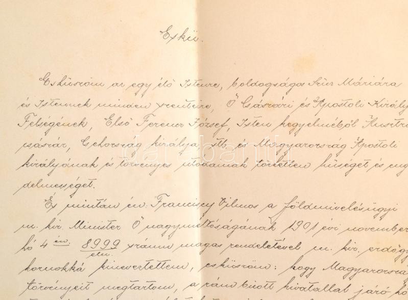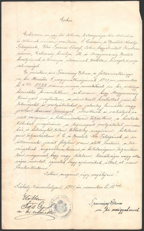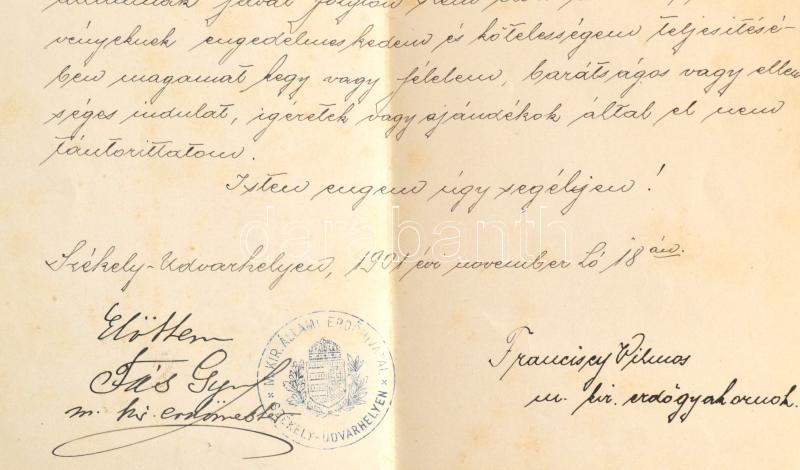 1901 Székelyudvarhely, erdőtiszti eskü, székelyudvarhelyi M. Kir. Állami Erdőhivatal pecsétjével, aláírásokkal, 1901. nov. 18., hajtásnyommal. / 1901 Odorheiu Secuiesc, forest officer oath, with the stamp of the Hungarian Royal Forest Office and with signatures.
