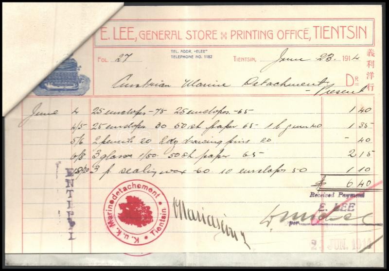 1914 K.u.K. Marinedetachement Tientsin. Nyugta számlákkal és címszalag... https://www.darabanth.com/hu/33-Nagyaukcio/33.1/Mutargy-papirregiseg-egyeb/Okmanyok~13865/1914-KuK-Marinedetachement-Tientsin-Nyugta-szamlakkal-es-cimszalag-1914-KuK-Marinedeta~II2134516