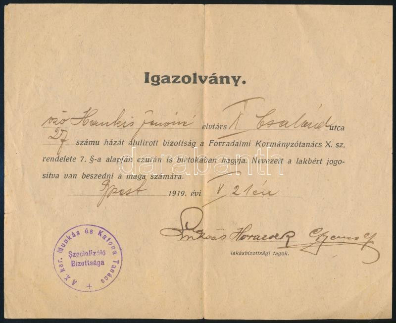 Leírás: 1919 Lakbérbeszedői igazolvány, Bp., 1919. V. 21., " A X. Ker. Munkás és Katona Tanács Szocializáló Bizottsága pecséttel", aláírásokkal.