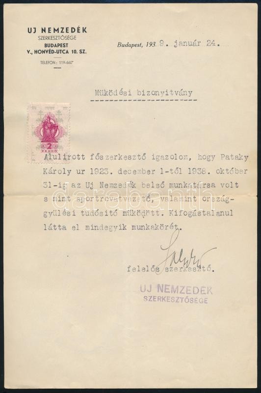 1939 Uj Nemzedék folyóirat működési bizonyÃtványa Pataki Károly (1900-1963) sportújságÃró részére, aki mint belsÅ‘ munkatárs és sportrovatvezetÅ‘ és országgyűlési tudósÃtó működött (1923-1938), a szerkesztÅ‘, Saly DezsÅ‘ (1892-1984) hÃrlapÃró aláÃrásával, fejléces papÃron.
