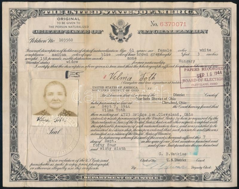1944 USA honosítási okirat magyar asszony részére / Certificate of Nat... https://www.darabanth.com/hu/33-Nagyaukcio/33.1/Mutargy-papirregiseg-egyeb/Okmanyok~13865/1944-USA-honositasi-okirat-magyar-asszony-reszere-Certificate-of-Naturalization-for-a-Hungaria~II2140735
