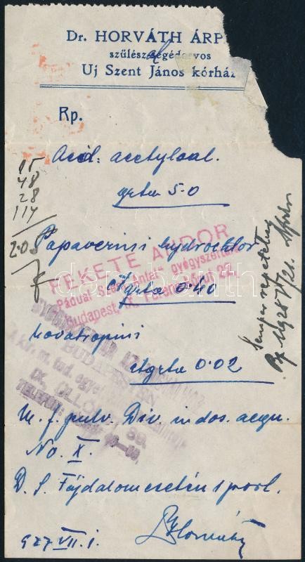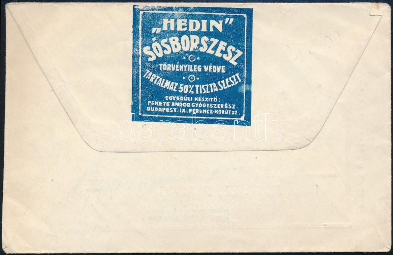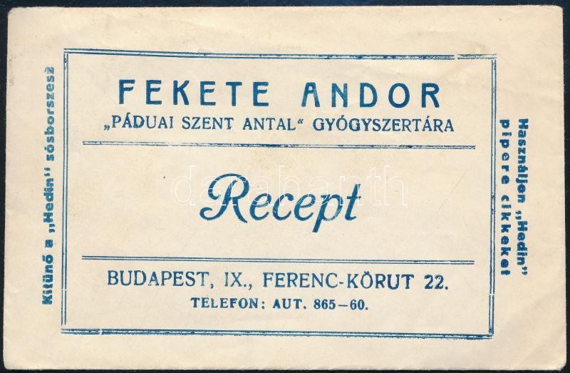 Fekete Andor "Páduai Szent Antal" Gyógyszertára Budapest IX. Ferenc körút receptboríték, hátoldalon a Hedin sósborszesz reklámjával, belsejében recepttel