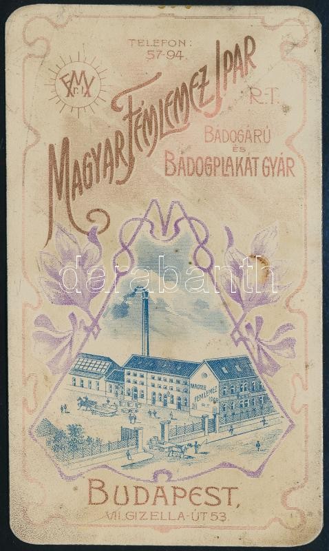 Magyar Fémlemez Ipar Rt. Bádogárú és Bádogplakát Gyár Budapest VI. fém... https://www.darabanth.com/hu/33-Nagyaukcio/33.1/Mutargy-papirregiseg-egyeb/Reklam~13897/Magyar-Femlemez-Ipar-Rt-Badogaru-es-Badogplakat-Gyar-Budapest-VI-fem-reklamkartyaja-r~II2124922