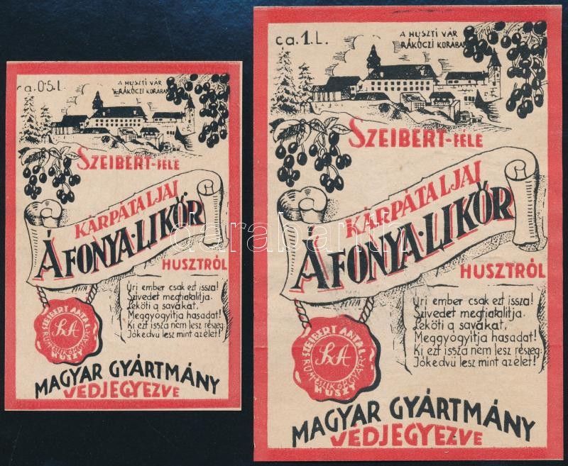 Szeibert-féle Kárpátaljai Áfonyalikőr Husztról, 2 db címke https://www.darabanth.com/hu/33-Nagyaukcio/33.1/Mutargy-papirregiseg-egyeb/Reklam~13897/Szeibert-fele-Karpataljai-Afonyalikor-Husztrol-2-db-cimke~II2134127