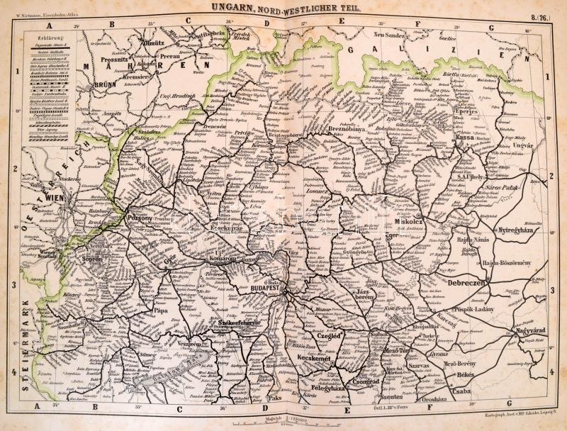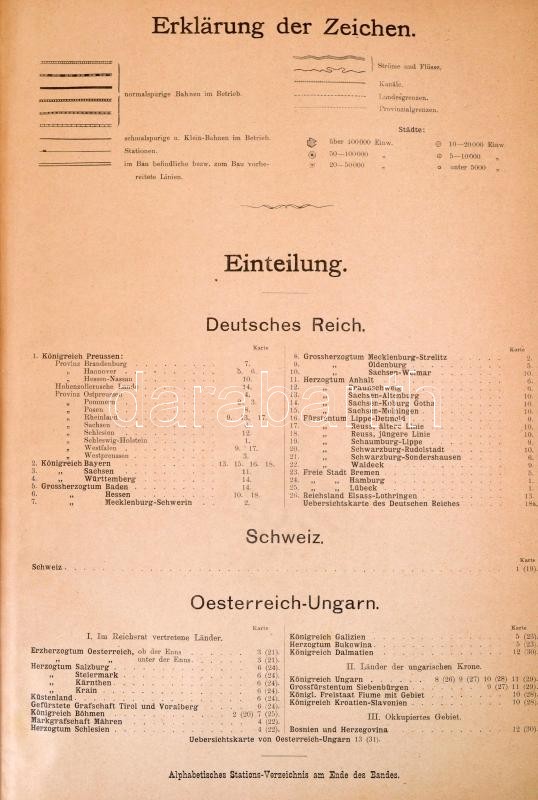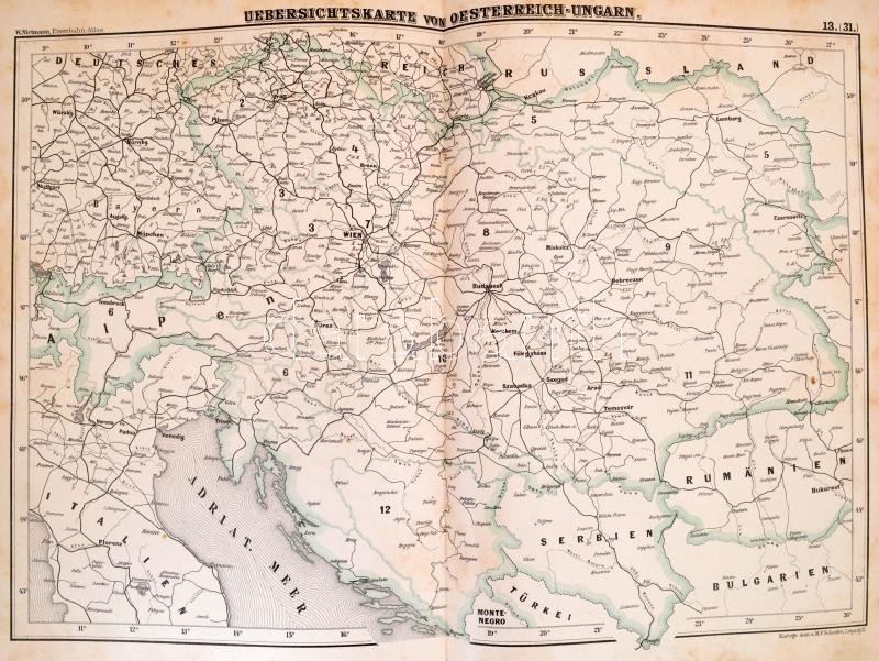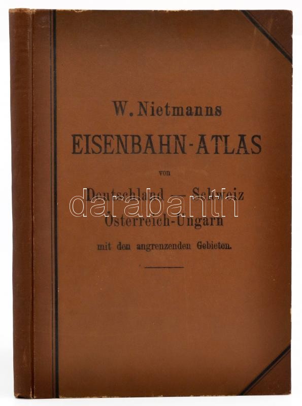 1899 W. Nietmann: Eisenbahn-Atlas von Deutschland - Schweiz - Österreich-Ungarn und das angrenzenden Gebieten. Dargestellt in 30 nach politischen Gebieten und Provinzen getrennten Spezialkarten, 2 Übersichtskarten und vollständigem Stationsverzeichnis. Méretarány: 18 db 1:800.000, 7 db 1:250.000, 1 db. 1:600.000, 1 db. 1:180.000, 1 db. 1:450.000, 1 db.1:500.000, 3 db méretarány nélkül. Leipzig, 1899, W. Nietmanns Verlag, 6 p.+31+1 t.+27+1 p. XVII. kiadás. Német nyelven. Kiadói egészvászon-kötés, kis kopásnyomokkal.