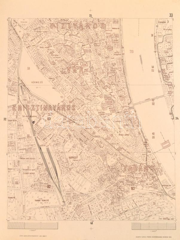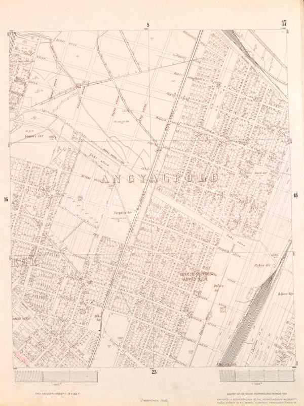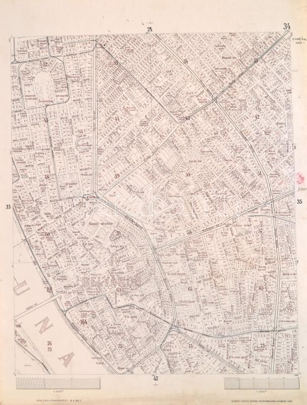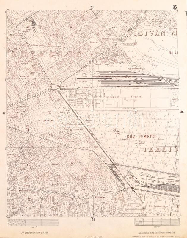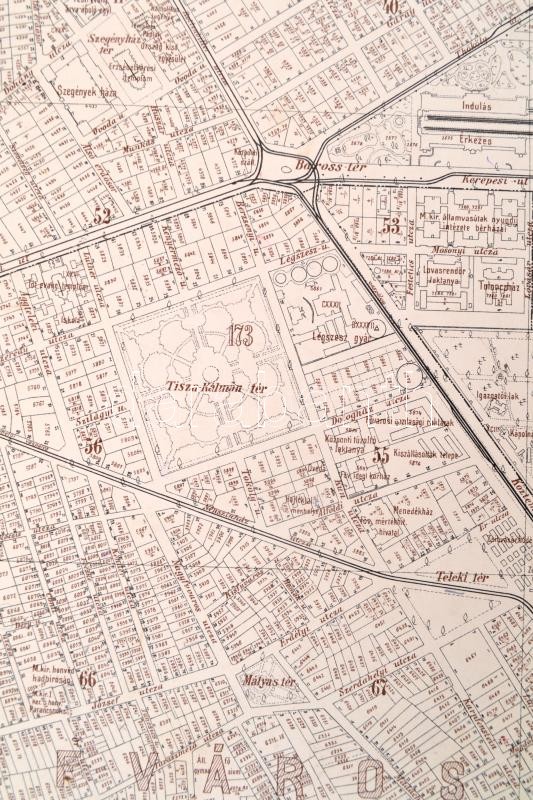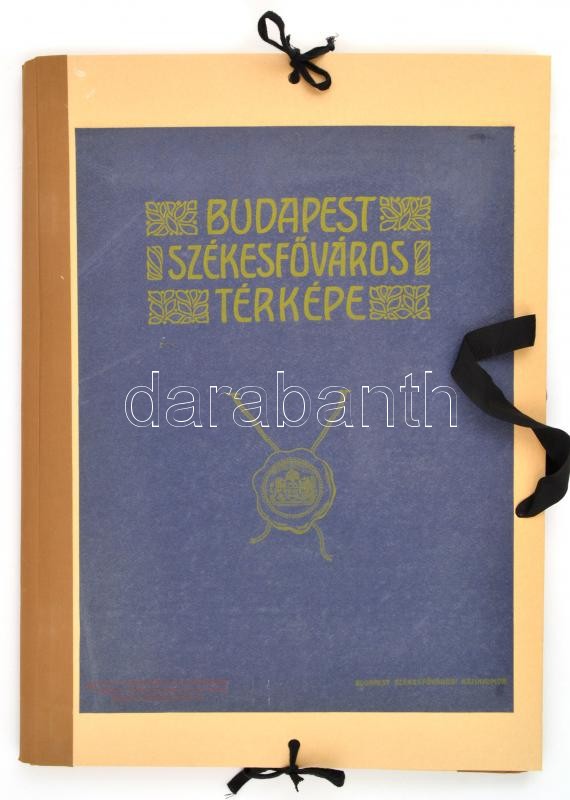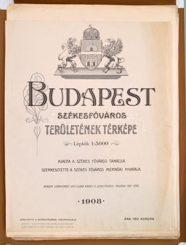 1908 Budapest Székesfőváros területének térképe, 1:5000, szerk. Székesfőváros Mérnöki Hivatala, kiadja: Székesfőváros Tanácsa, 69 lap, közte szélén több vágott, új mappában, rajta a régi címlappal, 58×40 cm