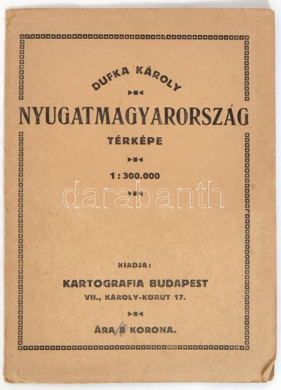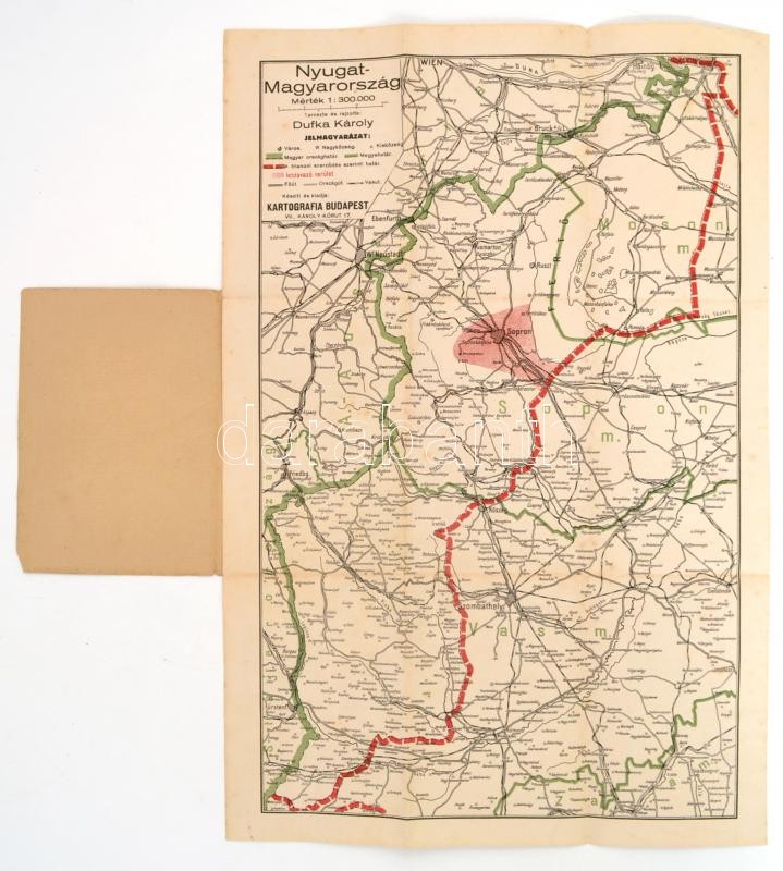 1921 Dufka Károly: Nyugat-Magyarország térképe, 1:300.000, Bp., Kartográfia, a Trianoni határokkal, és a népszavazásra jogosult területtel (Sopron és környéke), kiadói papírborítóval, 31x48 cm.