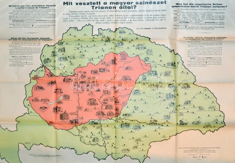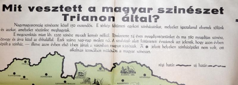 cca 1928 Mit vesztett a magyar szinészet Trianon által? Rajzolta: Abonyi Zoltán. Az adatokat Erődi Jenő állította össze. A térkép B. Kovács Andor osztályvezető terve alapján készült. Magyar, német, angol, francia, és olasz nyelven. Bp., Országos Színészegyesület és Nyugdíjintézet Propaganda Osztálya, (Thália-ny.), ceruzás dátumozással, jó állapotban, 73x105 cm