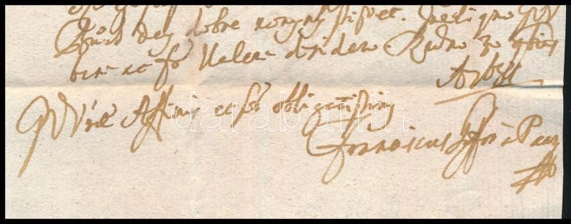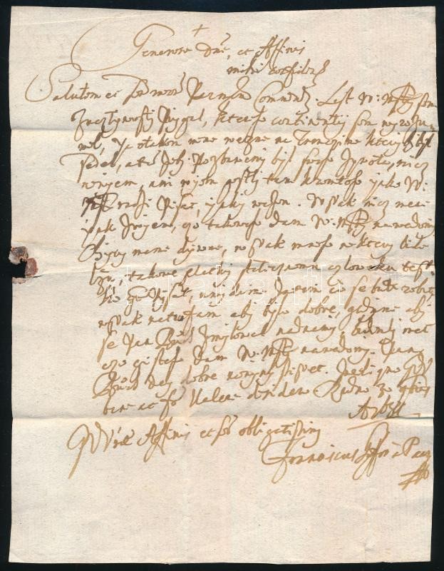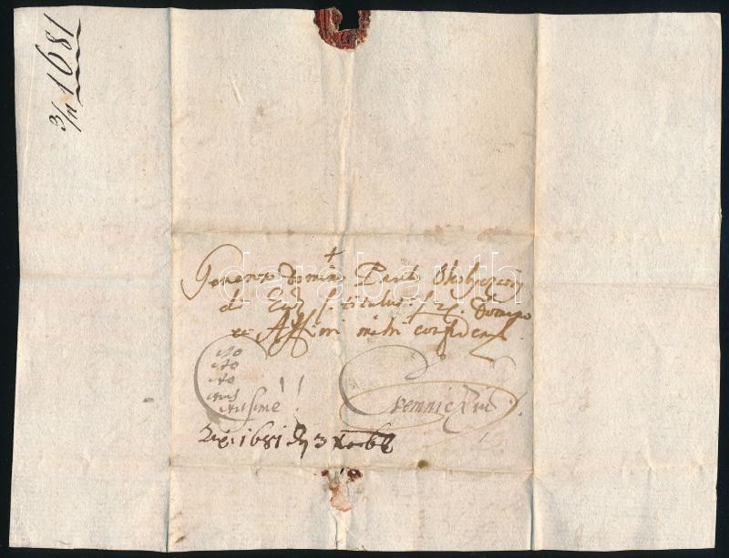 1681 Rudnó (Nyitrarudnó, ma Divékrudnó/Nitrianske Rudno, SK), paári Gáffor Ferenc postamester levele hivatalos ügyben Okolicsányi Pál Turóc vármegyei birtokos, II Rákóczi Ferenc későbbi jogtanácsosa részére, szláv nyelven, a külzeten sérült gyűrűspecséttel / 1681 Nitrianske Rudno, a letter written by postmaster Ferenc Gáffor of Paár regarding official matters, sent to Pál Okolicsányi, noble from Turóc County, later legal adviser to Ferenc Rákóczi II, written in Slovak and Latin, with damaged vax seal on the outside