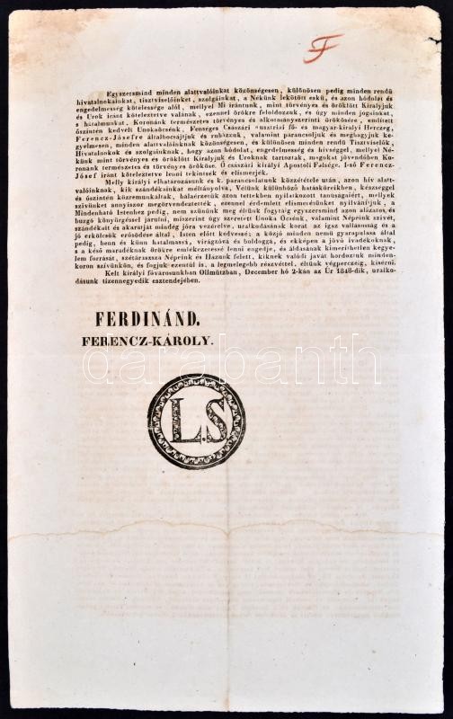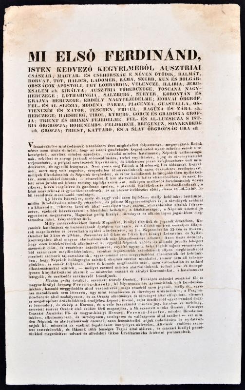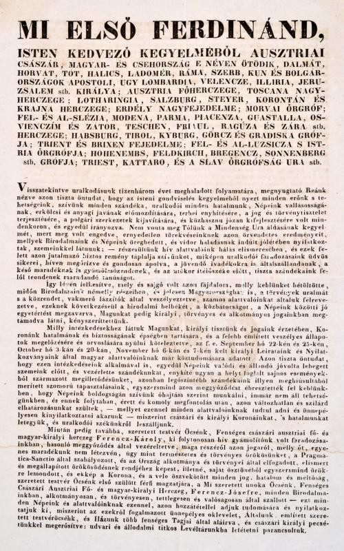1848. december 2. Az Olmützi proklamáció, melyben V. Ferdinánd lemond a trónról, Ferenc Károly főherceg pedig a trónutódlásról Ferenc József javára. Kétoldalas nyomtatvány. / 1849 Proclamation made in Olmütz in which Ferdinand V. resigns from the throne in favor of Franz Josef. 24x40 cm