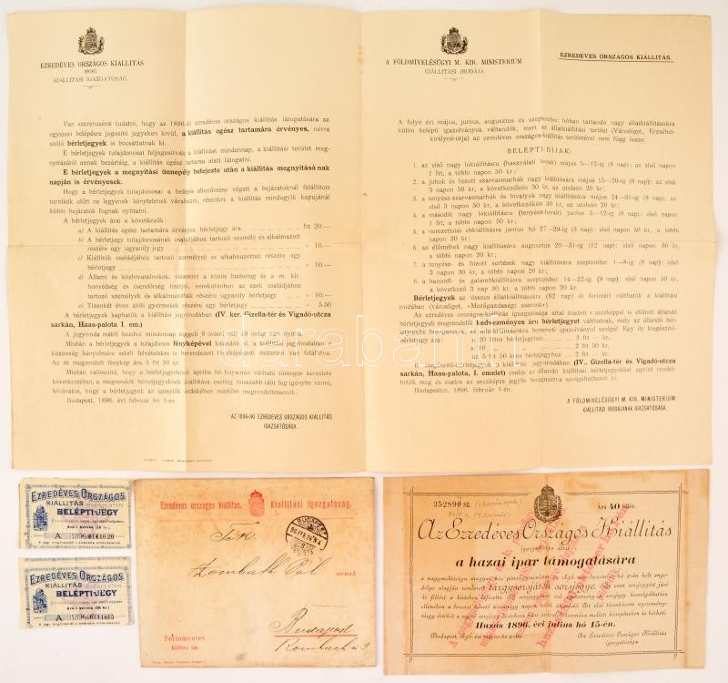 1896 Ezredéves Országos Kiállítás ismertető prospektusa, belépti díjakkal, 2 sztl. lev. A kiállítás fejléces borítékjával, két belépő jeggyel és az Ezredéves Országos Kiállítás igazgatósága által a hazai ipar támogatására rendezett sorsjáték 40 f. sorsjegyével.
