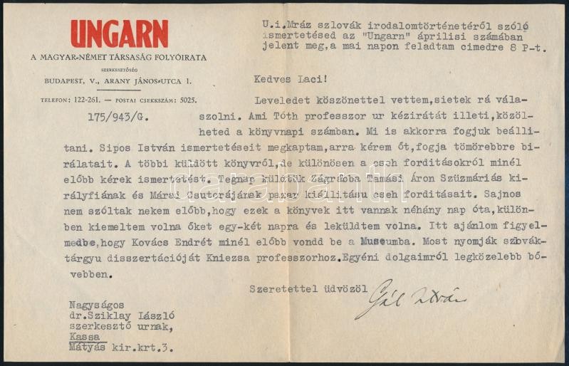 1943 Gál István (1912-1982) irodalomtörténész, az Ungarn, Magyar-Német Társaság folyóirat segédszerkesztőjének gépelt levele dr. Sziklay László (1912-1987) főiskolai tanár, irodalomtörténész részére, fejléces papíron, aláírással. / 1943 Letter from István Gál (1912-1982) literary historian, second editor of Ungarn, the magazine issued by the Hungarian-German Society, to dr. László Sziklay(1912-1987) teacher, literary historian, with his signature.