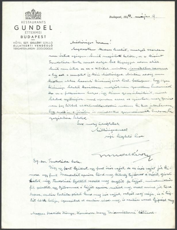 1944 Gundel Károly (1883-1956) vendéglÅ‘s, gasztronómiai szakÃró saját kézzel, recept ügyben Ãrt levele, aláÃrásával, a levél alján a recepttel, fejléces az étterem fejléces papÃrján, 1944. május 9.