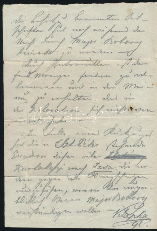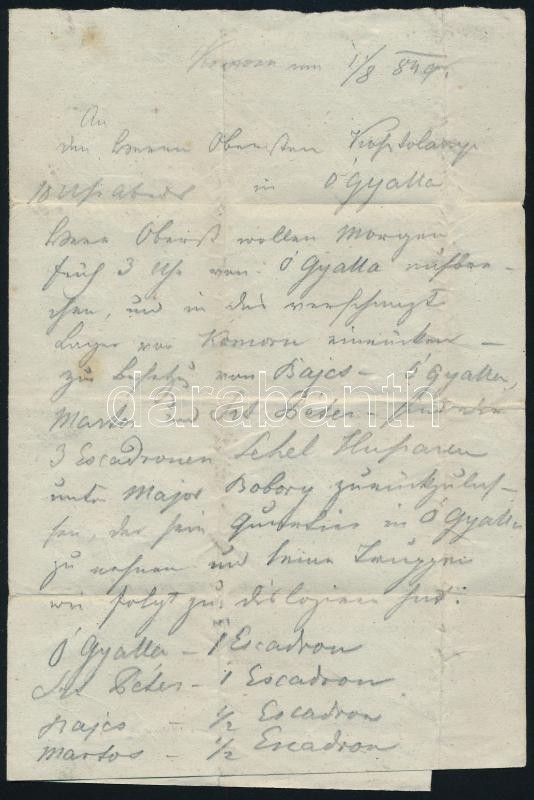 VÉDETT - NO EXPORT1849 augusztus 1. Klapka György (1820-1892) honvédtábornok saját kezű, német nyelven írt levele Kosztolányi Mór (1806-1884) honvéd ezredes részére, melyben az augusztus 3-diki nagyszabású komáromi kitörés hadászati részleteit egyezteti vele. A 'Szabadságharc legszebb hadműveletének' is nevezett manővert, melynek során felszámolták a Komáromot körülvevő ostromgyűrűt, Kosztolányi egy korábbi kitörése készítette elő, melyben Tatán az ellenség élelmiszerkészlete mellett megszerzett fontos információkat tartalmazó iratokat is. Két ceruzával beírt oldal / 1st of August 1849, letter written by Hungarian general György Klapka (1820-1892) in German, to colonel Mór Kosztolányi (1806-1884), in which he coordinates the details of the military operations on 3th of August, which ended the siege of Komarno and is regarded as the best military maneuver of 1848/49. 2 pages. Fordítás: Komárom, 1/8. 849. Kosztolányi ezredes úrnak Ógyallán, este 10 órakor Ezredes úr holnap reggel 3 órakor elindul Ógyalláról, és a Komárom előtti elsáncolt táborba bevonul. Bajcs - Ógyalla - Martos - Szentpéter megszállására hagyja hátra a 3 Lehel-huszár századot Bobory őrnagy alatt, aki Ógyallán üti fel szállását és csapatait a következőképpen diszlokálja: Ógyalla - 1 század Szt.Péter - 1 század Bajcs - 1/2 század Martos - 1/2 század. [Második oldal:] A megnevezett helységek megszállását Bobory őrnagy még az éj folyamán hajtsa végre. Holnap az ellenség járőrök által folytonosan felriasztandó, és azon véleményben tartandó, hogy a diszlokációban semmi sem változott. Visszavonulás esetén a Szt.Péteren álló század ezt Kurtakeszin át Izsára, a többiek a sáncok felé hajtsák végre, amiről Ön azonnal értesítse Bobory őrnagy urat. Klapka tábornok