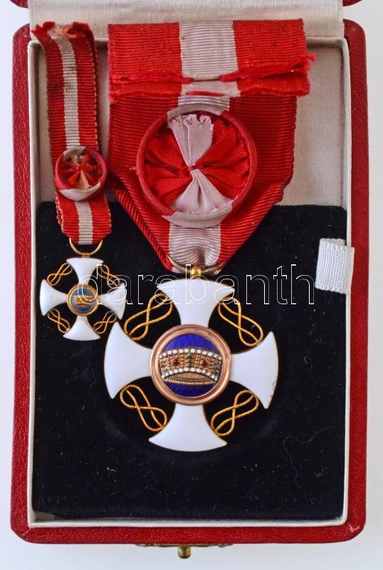 Olaszország DN "Olasz Koronarend Tisztikeresztje" Au zománcozott kitüntetés mellszalaggal, miniatűrrel, eredeti tokban (36mm) T:1- használatból eredő zománchiba / Italy ND "Italian Order of the Crown, Officer's Cross" Au enamelled decoration with ribbon, miniature, in original case (36mm) C:AU minor enamel damage caused by usage