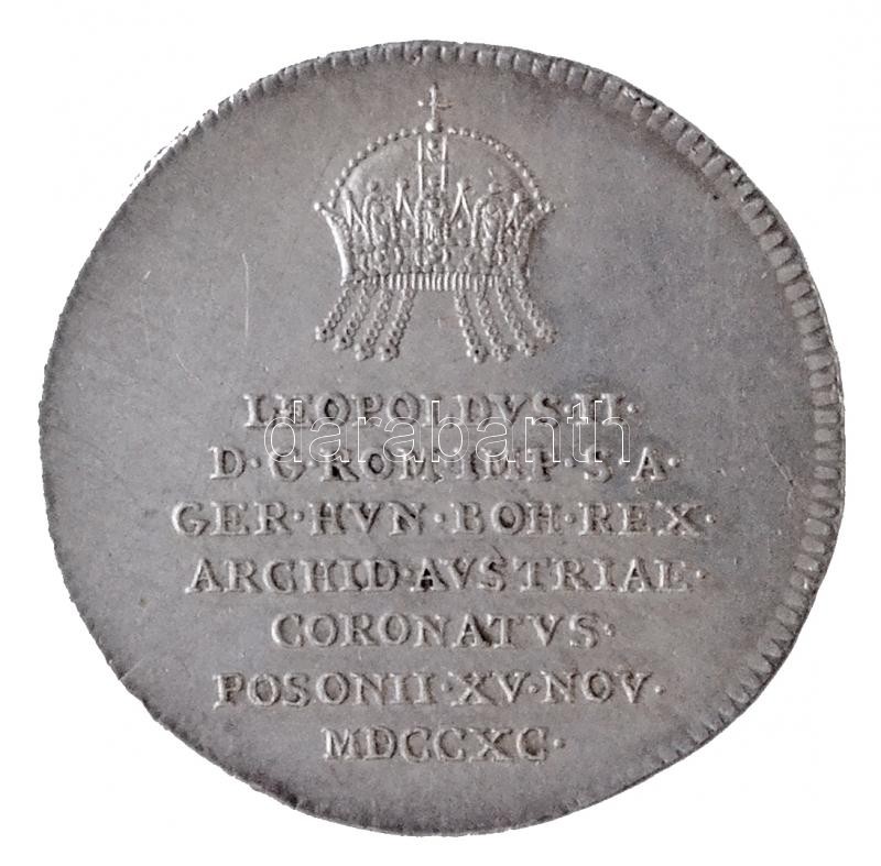 Habsburg Birodalom 1790. "II. Lipót pozsonyi koronázása" Ag zseton. "LEOPOLDVS II - D G ROM IMP S A - GER HVN BOH REX - ARCHID AVSTRIAE - CORONATVS - POSONII XV NOV - MDCCXC / PIETATE ET CONCORDIA" (2.21g/20mm) T:1-,2 / Habsburg Monarchy 1790. "Coronation of Leopold II" Ag token (2.21g/20mm) C:AU,XF