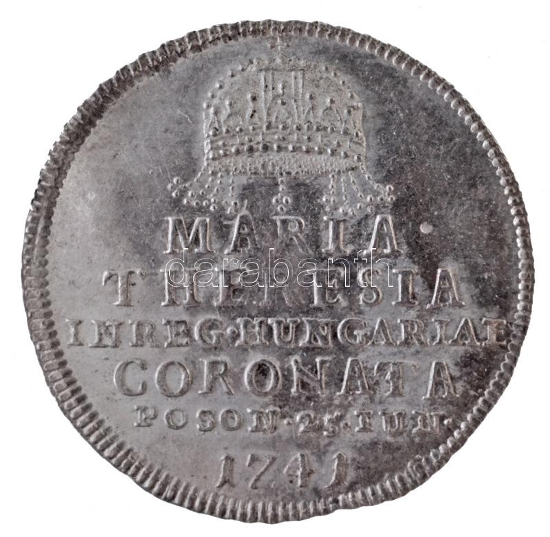 Habsburg Monarchia 1741. "Mária Terézia koronázása Pozsonyban" Ag zseton. "MARIA - THERESIA - IN REG HVNGARIAE - CORONATA - POSON 25 IVN - 1741 / IVSTITIA ET CLEMENTIA" (1,94g/21mm) T:2 / Habsburg Monarchy 1741. "Coronation of Maria Theresia in Poson" Ag token (1,94g/21mm) C:XF
