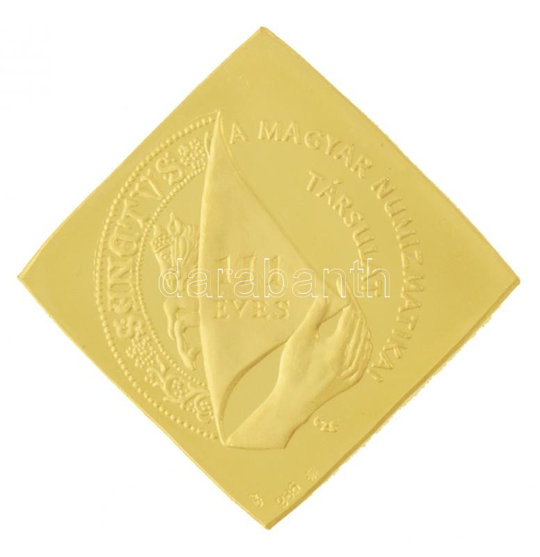 2012. "111 éves a Magyar Numizmatikai Társulat" kétoldalas, jelzett Au emlékérem, tanúsítvánnyal (10,53g/0.986/25x25mm) T:PP fo. / Hungary 2012. "111th Anniversary of the Magyar Numizmatikai Társulat (Hungarian Numismatic Society)" double sided hallmarked Au commemorative medallion with certificate (10,53g/0.986/25x25mm) C:PP spotted