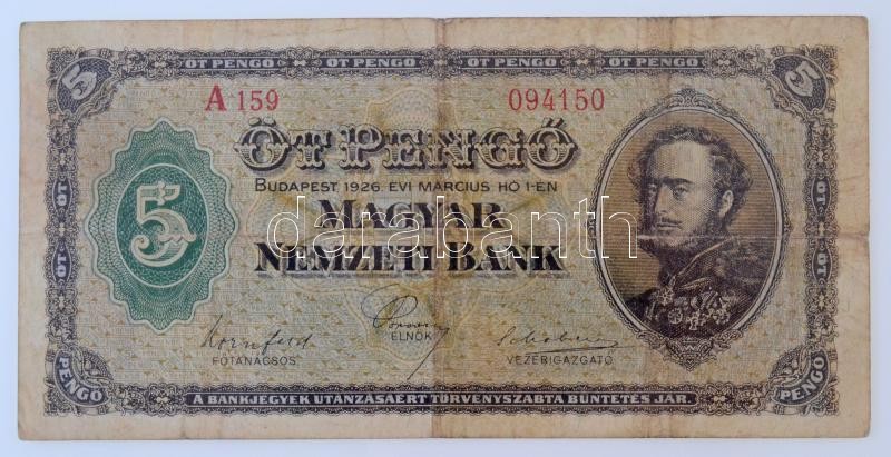Leírás: 1926. 5P "A159 - 094150" T:III,III- / Hungary 1926. 5 Pengő "A159 - 094150" C:F,VG