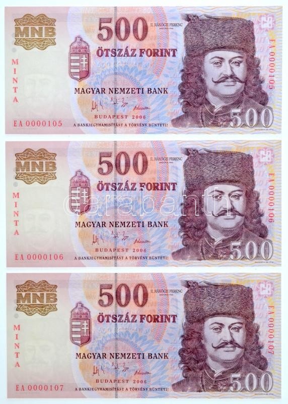2006. 500Ft (3x) "MINTA" felülnyomással, sorszámkövetők &quo... https://www.darabanth.com/hu/33-Nagyaukcio/33.1/Numizmatika/Magyar-es-kulfoldi-bankjegyek~13837/2006-500Ft-3x-MINTA-felulnyomassal-sorszamkovetok-EA-0000105-EA-0000107-TI-Hungary~II2125925
