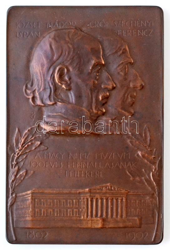 Beck Ö. Fülöp (1873-1945) 1902. "A Magyar Nemzeti Múzeum 100 éves fennállásának emlékére 1802-1902" egyoldalas Br plakett, eredeti "M. NEMZ. MÚZEUM 1802-1902" feliratú tokban. "JÓZSEF NÁDOR ISPÁN - GRÓF SZÉCHÉNYI FERENCZ - A MAGY NEMZ MVZEVM 100 ÉVES FENNÁLLÁSÁNAK EMLÉKÉRE 1802-1902" (84,94g/75x50mm) T:1,1- / Hungary 1902. "100th Anniversary of the National Museum 1802-1902" one-sided Br commemorative plaque. Sign.: Fülöp Beck Ö. (84,94g/75x50mm) C:UNC,AU