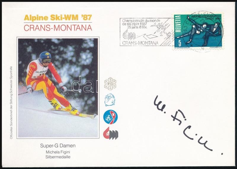 Leírás: Michela Figini (1966- ) síelő aláírása emlékborítékon