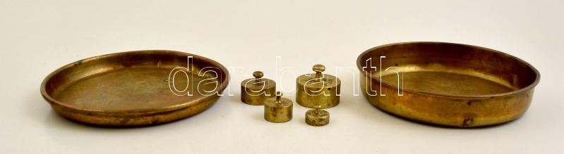 Leírás: 2 db réz mérlegserpenyő + 4 db réz súly (2, 5, 10, 20 dkg)
