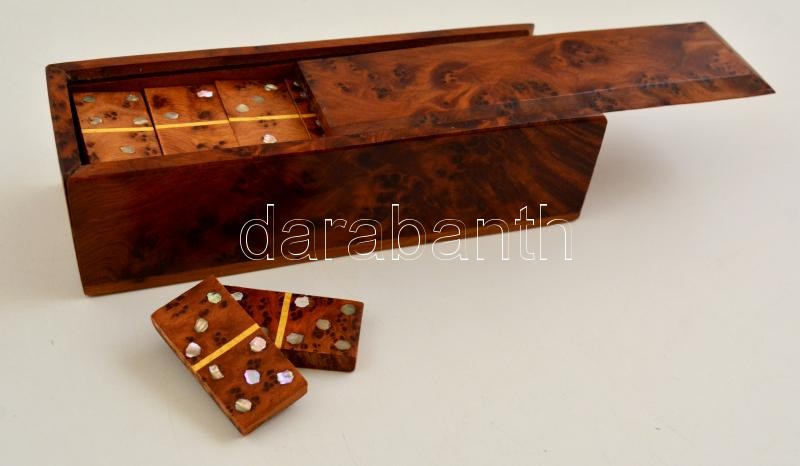 Fa dominó készlet, gyöngyház berakással, hiánytalan, 16×5,5 cm https://www.darabanth.com/hu/330-Gyorsarveres/330.0/Festmeny-mutargy-papirregiseg-egyeb/Bolhapiac~500011/Fa-domino-keszlet-gyongyhaz-berakassal-hianytalan-16C3975-5-cm~II1842363