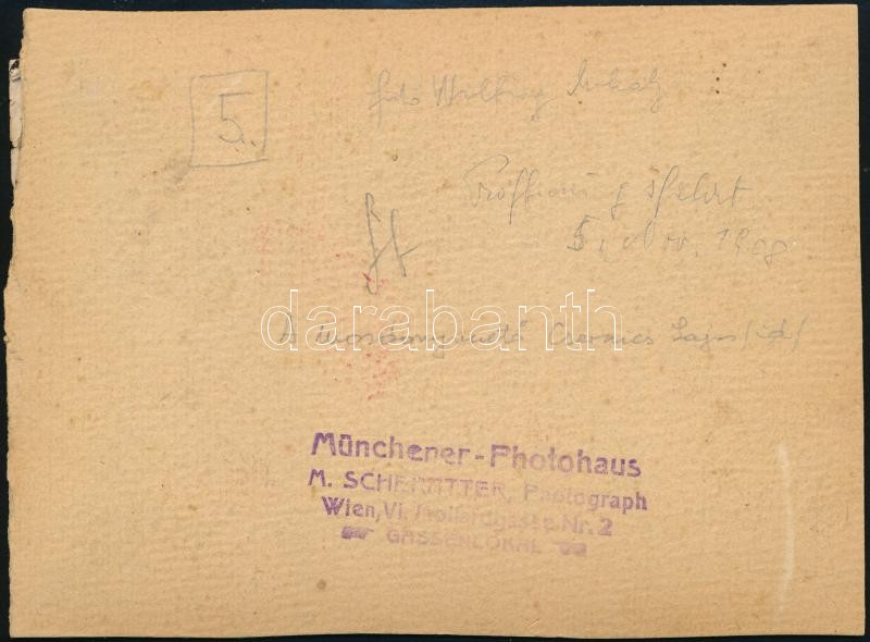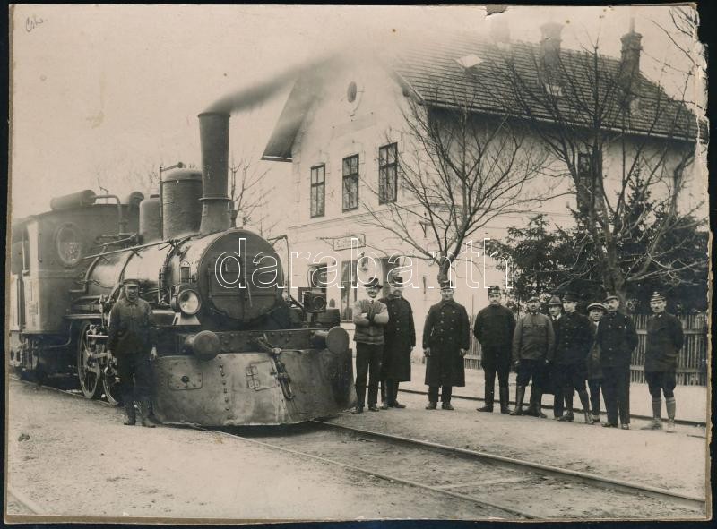 Leírás: 1908 Lapompak (Lackenbach), vasútállomás mozdonnyal (mozdonyvezető: id. Csernics Lajos), fotó, kartonra ragasztva, a Münchener-Photohaus bécsi műterméből, hátulján feliratozva, pecséttel jelzett, 12×16 cm