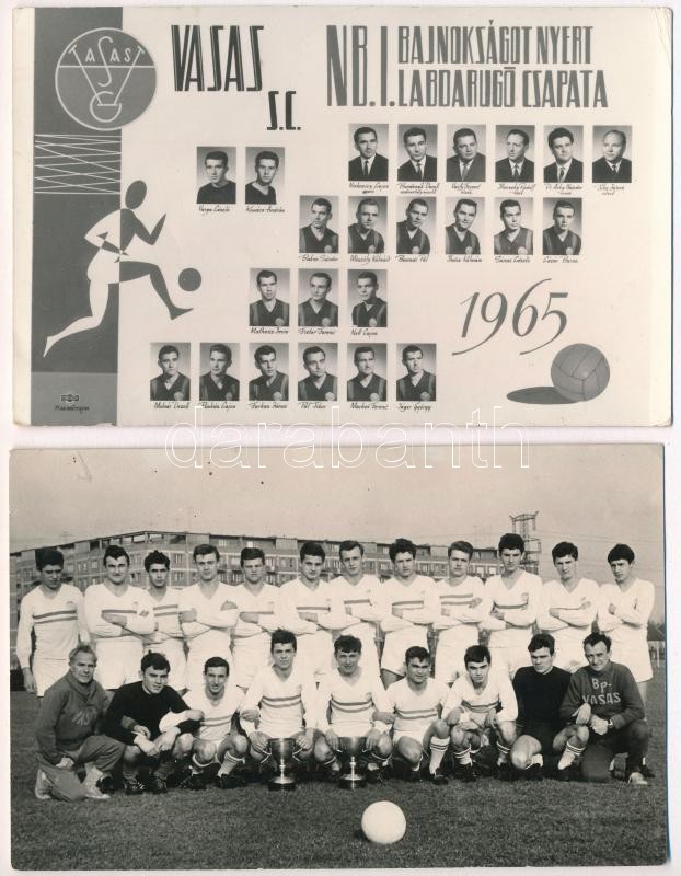 Leírás: 1965 Vasas S.C. NB. I. bajnokságot nyert labdarúgó csapata, 2 db fotó, 9×14 cm