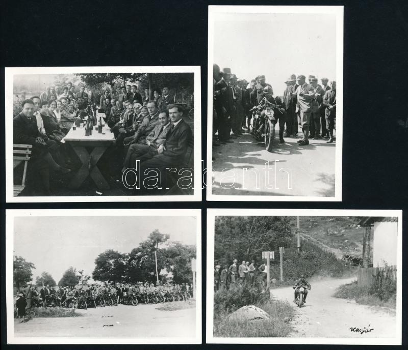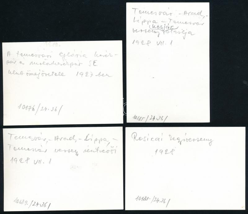 1927-1928 Motorversenyek és motorversenyzők, a temesvári Glória SE klub tagjai, temesvári verseny, resicai verseny, stb., 4 db feliratozott, utólagos előhívás, 6,5×9,5 cm