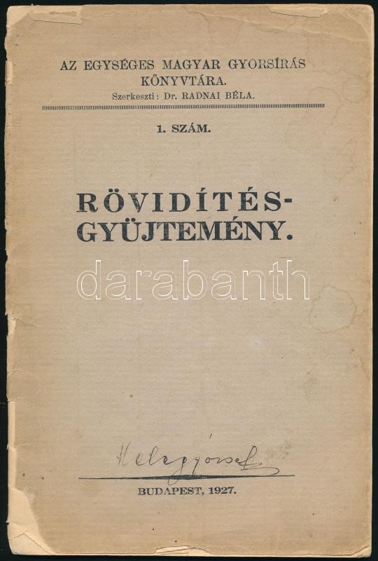 1927 Az Egységes magyar Gyorsírás Könyvtára 1. szám, rövidítésgyűjtemé... https://www.darabanth.com/hu/330-Gyorsarveres/330.0/Festmeny-mutargy-papirregiseg-egyeb/Nyomtatvanyok~500029/1927-Az-Egyseges-magyar-Gyorsiras-Konyvtara-1-szam-roviditesgyujtemeny-megviselt-alla~II1842154