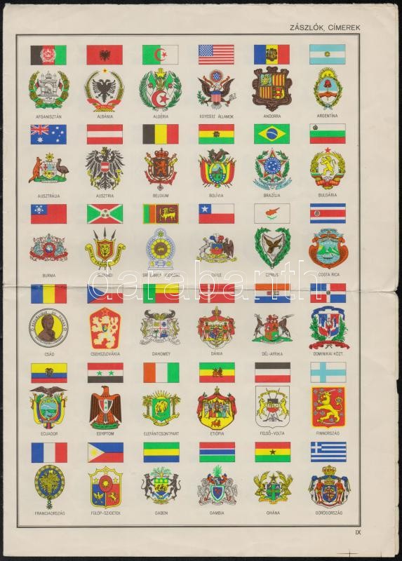 cca 1980 Zászlók és címerek, részlet egy földrajzi atlaszból, hajtott https://www.darabanth.com/hu/330-Gyorsarveres/330.0/Festmeny-mutargy-papirregiseg-egyeb/Nyomtatvanyok~500029/cca-1980-Zaszlok-es-cimerek-reszlet-egy-foldrajzi-atlaszbol-hajtott~II1839898
