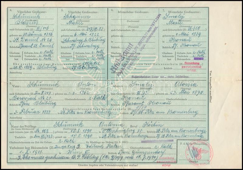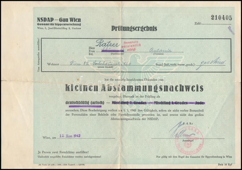 1942 Német birodalmi származási igazolás "árja" származásról https://www.darabanth.com/hu/330-Gyorsarveres/330.0/Festmeny-mutargy-papirregiseg-egyeb/Okmanyok~500016/1942-Nemet-birodalmi-szarmazasi-igazolas-arja-szarmazasrol~II1839392